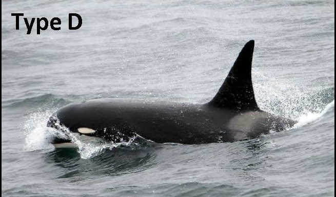 Type D was identified based on photographs of a 1955 mass stranding in New Zealand and six at-sea sightings since 2004. It is immediately recognizable by its extremely small white eye patch, shorter than usual dorsal fin, and bulbous head (similar to a pilot whale).Although nothing is known about the type D diet, it is suspected to include fish because groups have been photographed around longline vessels where they reportedly prey on Patagonian toothfish